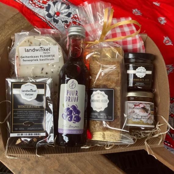 Lief kartonnen doosje waar mooi folietje met lintje overheen gaat. Gevuld met heerlijke Flakkeese producten, alleen al voor de eigen-gemaakte Damdijk-koek (nergens anders te krijgen) zou ik dit pakketje willen krijgen.